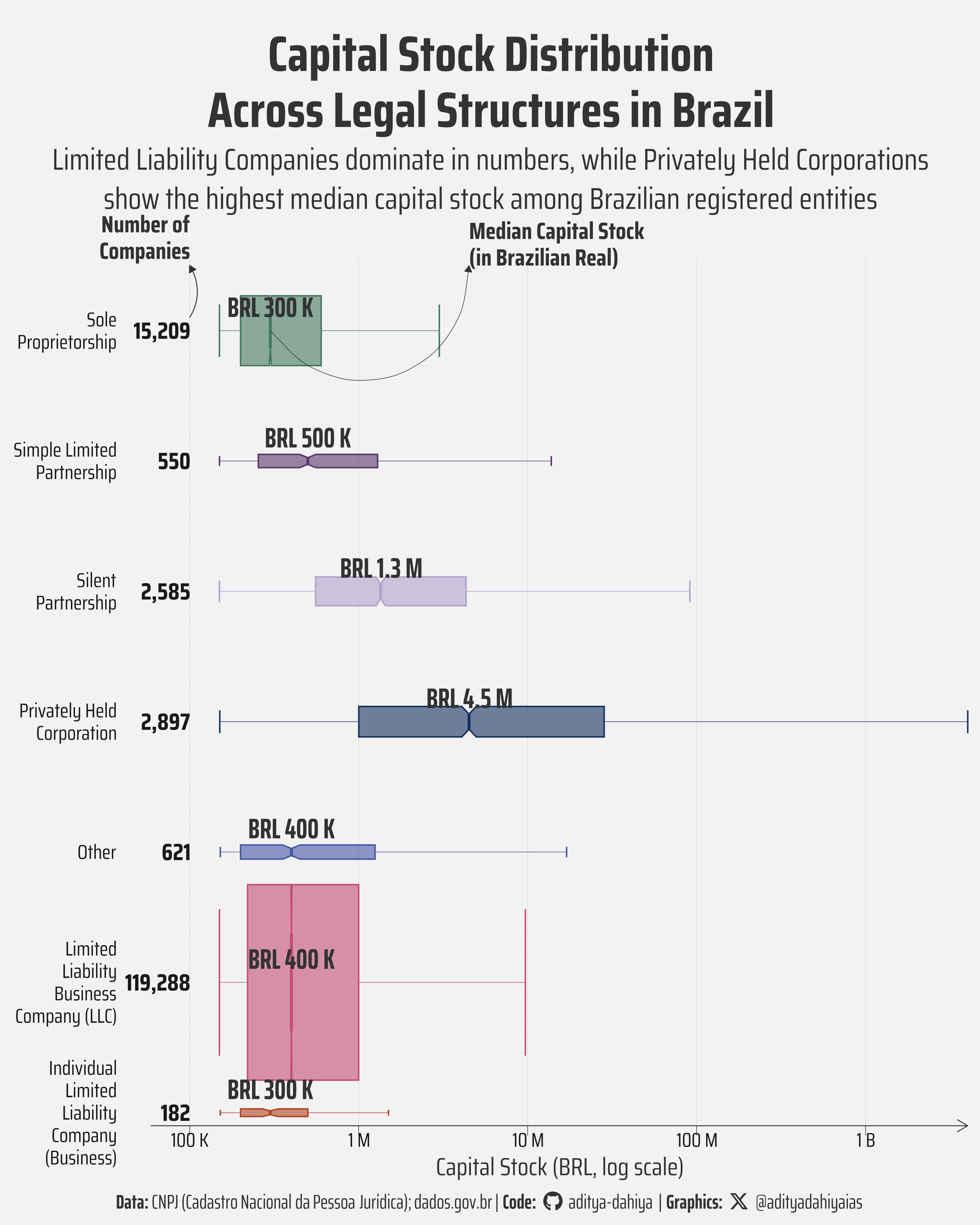 Figure 1: The graph shows the capital stock (in log scale, in Brazilian Real) along the X-axis, and the 7 different legal structures of companies along the Y-axis. Each boxplot’s width corresponds to the total number of companies in that category. The text annotations show number of companies (on left of the boxplots) and the value of median capital stock for each category (i.e. the central line of the boxplot) is labelled.