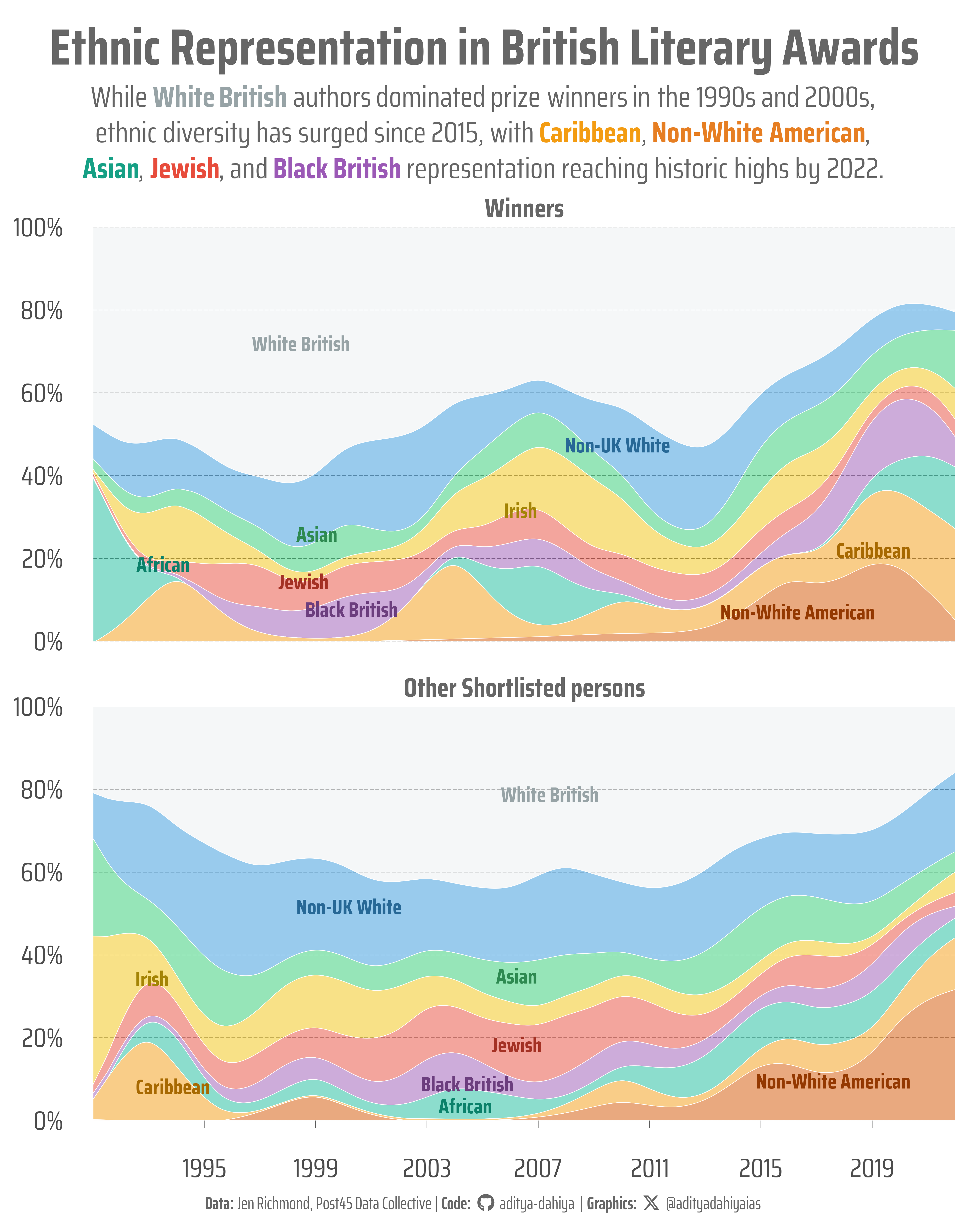 This visualization was created using R and the tidyverse ecosystem for data manipulation and plotting. The graphic employs ggstream::geom_stream() to create proportional streamgraphs that elegantly show the changing ethnic composition of British literary prize winners and shortlisted authors over time, with ggstream::geom_stream_label() adding labels directly onto the flowing streams. Color palettes were sourced from paletteer using the “flat_dark” theme from ggthemr, with colors further enhanced using colorspace::darken() for better label contrast. Typography was handled through showtext to incorporate Google Fonts (Saira family), while ggtext enabled markdown formatting in plot text elements. The scales package provided clean percentage formatting for the y-axis, and patchwork was loaded for potential plot composition. Faceting with custom labels separated winners from other shortlisted individuals, creating a compelling visual narrative of diversity trends in British literary prizes from 1990 to 2022.