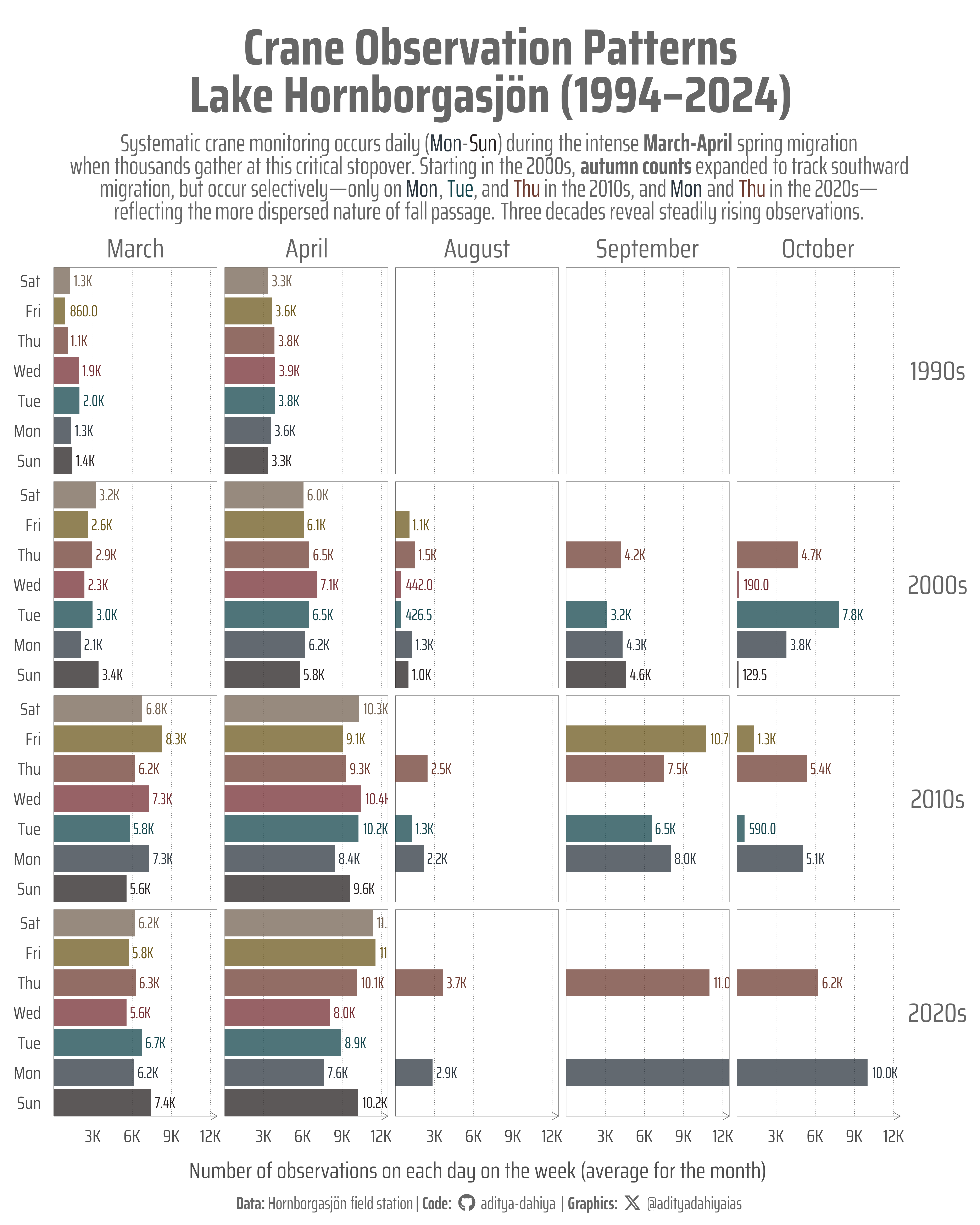 Figure 1: Visualization shows mean crane observations by weekday (y-axis), faceted by month (columns) and decade (rows). Bar length represents average observation count for each day-month-decade combination, with numeric labels showing exact values. Spring months (March-April) display comprehensive daily monitoring across all seven weekdays, while autumn months (August-October) show strategic sampling on selected days only. Growing bar lengths across decades indicate increasing observation frequencies. Colors distinguish weekdays using the Ghibli PonyoDark palette. Data: Hornborgasjön field station crane counts (1994-2024). Missing bars indicate no observations recorded for that weekday-month combination.