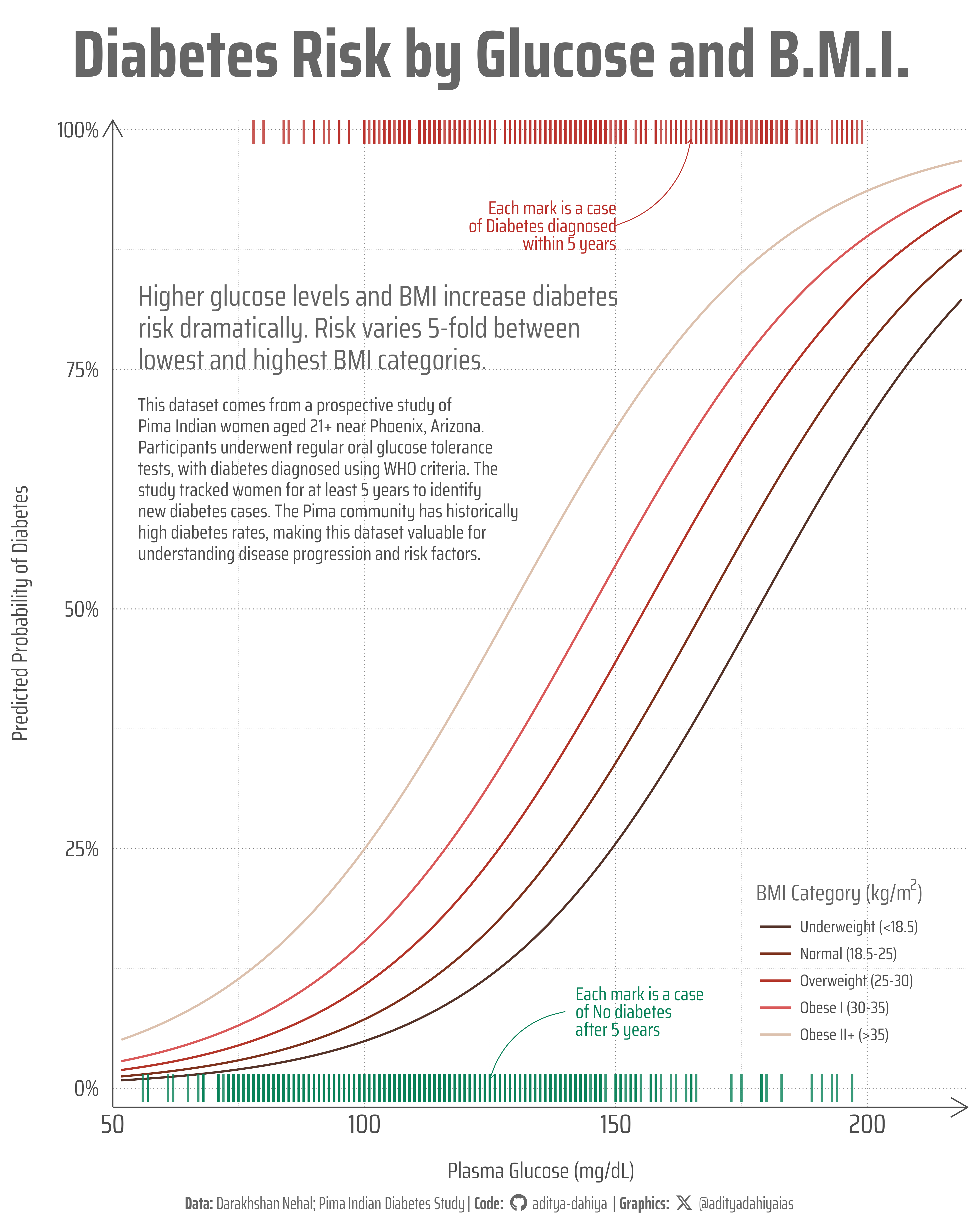 g <- plotdf |>ggplot(mapping =aes(x =`glucose_mg-dl`, y = pred_prob,colour = bmi_category ) ) +geom_line(linewidth =1.2 ) +scale_x_continuous(expand =expansion(0),limits =c(50, 220) ) + paletteer::scale_colour_paletteer_d("fishualize::Epinephelus_striatus",name =expression("BMI Category (kg/m"^2*")") ) +scale_y_continuous(labels = scales::percent_format(),expand =expansion(c(0.02, 0.01)) ) + ggnewscale::new_scale_colour() +geom_point(data = diabetes, mapping =aes(x =`glucose_mg-dl`, y = diabetes_binary, color = diabetes_5y ),alpha =0.8, size =36,shape =124# "|" character ) + paletteer::scale_colour_paletteer_d("ggthemes::wsj_red_green",guide ="none" ) +# Subtitle annotation in top leftannotate("text",x =55, y =0.75,label ="Higher glucose levels and BMI increase diabetes risk dramatically. Risk varies 5-fold between lowest and highest BMI categories."|>str_wrap(50),hjust =0, vjust =0,size = bts *0.45,family ="body_font",colour = text_hil,lineheight =0.3 ) +# About the Data annotationannotate("text",x =55, y =0.72,label =str_wrap("This dataset comes from a prospective study of Pima Indian women aged 21+ near Phoenix, Arizona. Participants underwent regular oral glucose tolerance tests, with diabetes diagnosed using WHO criteria. The study tracked women for at least 5 years to identify new diabetes cases. The Pima community has historically high diabetes rates, making this dataset valuable for understanding disease progression and risk factors.", width =55),hjust =0, vjust =1,size = bts *0.3,family ="body_font",colour = text_col,lineheight =0.3 ) +# Curved arrow and label for negative outcomes (green)annotate("curve",x =140, y =0.08,xend =125, yend =0.01,curvature =0.3,arrow =arrow(length =unit(2, "mm")),colour ="#088158FF",linewidth =0.5 ) +annotate("text",x =142, y =0.08,label ="Each mark is a case\nof No diabetes\nafter 5 years",hjust =0, vjust =0.5,size = bts *0.3,family ="body_font",colour ="#088158FF",lineheight =0.25 ) +# Curved arrow and label for positive outcomes (red)annotate("curve",x =150, y =0.9,xend =165, yend =0.99,curvature =0.3,arrow =arrow(length =unit(2, "mm")),colour ="#BA2F2AFF",linewidth =0.5 ) +annotate("text",x =150, y =0.9,label ="Each mark is a case\nof Diabetes diagnosed\nwithin 5 years",hjust =1, vjust =0.5,size = bts *0.3,family ="body_font",colour ="#BA2F2AFF",lineheight =0.25 ) +labs(title ="Diabetes Risk by Glucose and B.M.I.",x ="Plasma Glucose (mg/dL)",y ="Predicted Probability of Diabetes",caption = plot_caption ) +theme_minimal(base_family ="body_font",base_size = bts ) +theme(legend.position =c(0.85, 0.15),legend.background =element_rect(fill =NA,colour =NA,linewidth =0.3 ),legend.key.height =unit(4, "mm"),legend.key.width =unit(16, "mm"),legend.key.spacing.y =unit(5, "mm"),legend.title =element_text(size = bts,face ="bold",colour = text_hil,margin =margin(0,0,5,0, "mm") ),legend.text =element_text(size = bts *0.75,colour = text_col,margin =margin(0,0,0,2, "mm") ),# Overalltext =element_text(margin =margin(0, 0, 0, 0, "mm"),colour = text_col,lineheight =0.3 ),# Axesaxis.text.x.bottom =element_text(size = bts *1.2,margin =margin(3, 3, 3, 3, "mm") ),axis.text.y.left =element_text(size = bts,margin =margin(3, 6, 3, 3, "mm") ),axis.title =element_text(margin =margin(2,2,2,2, "mm") ),axis.ticks.x.bottom =element_blank(),axis.ticks.length.x =unit(0, "mm"),axis.ticks.length.y.left =unit(0, "mm"),axis.line =element_line(colour = text_col,arrow =arrow(length =unit(8, "mm")),linewidth =0.75 ),panel.grid.major =element_line(colour ="grey50",linewidth =0.5,linetype =3 ),panel.grid.minor =element_line(colour ="grey75",linewidth =0.25,linetype =3 ),# Labels and Strip Textplot.title =element_text(margin =margin(5, 0, 15, 0, "mm"),hjust =0.5,vjust =0.5,colour = text_hil,size =3* bts,family ="body_font",face ="bold",lineheight =0.25 ),plot.caption =element_markdown(family ="caption_font",hjust =0.5,margin =margin(5, 0, 0, 0, "mm"),colour = text_hil ),plot.caption.position ="plot",plot.title.position ="plot",plot.margin =margin(5, 5, 5, 5, "mm") )ggsave(filename = here::here("data_vizs","tidy_pima_diabetes_study.png" ),plot = g,width =400,height =500,units ="mm",bg = bg_col)