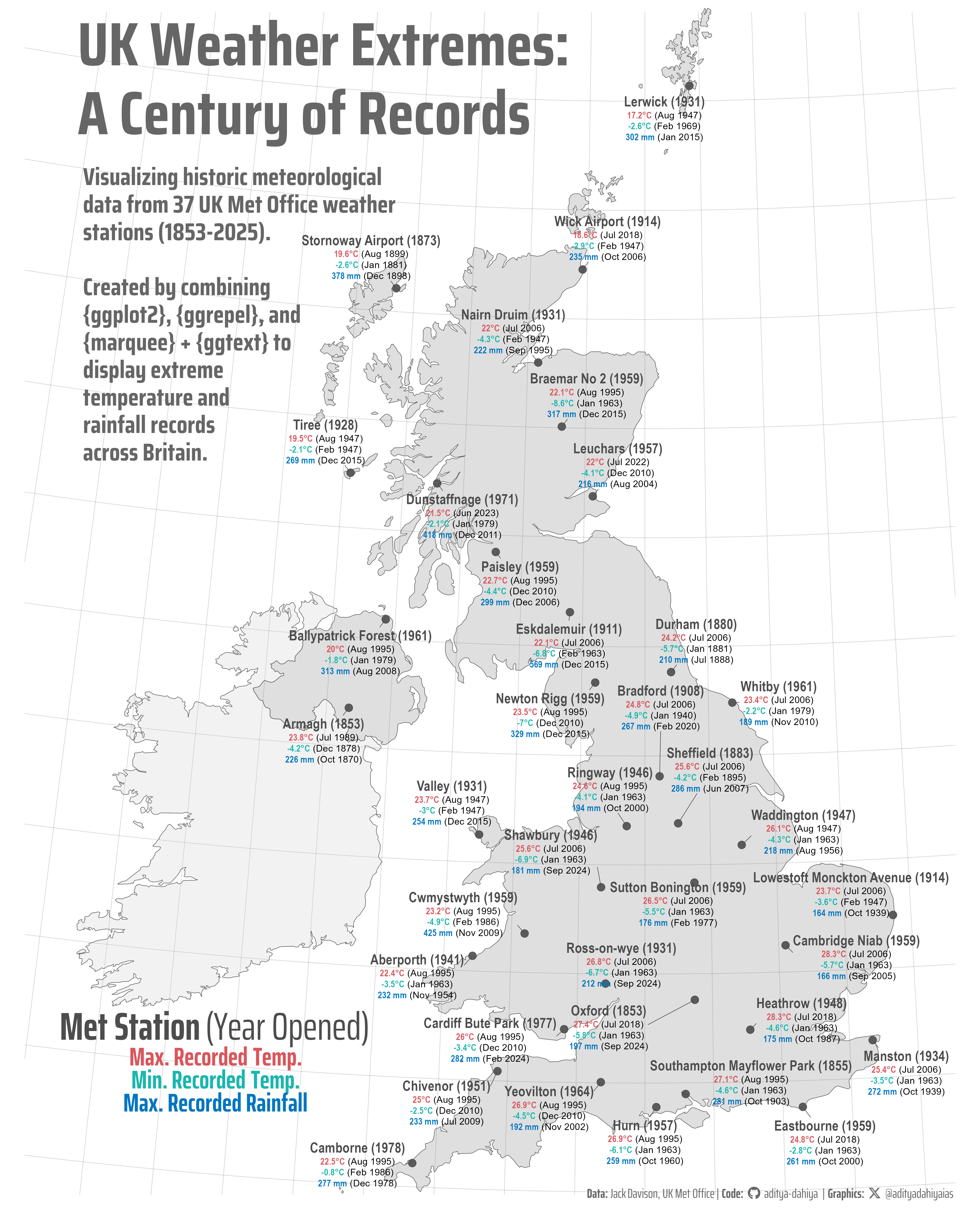 This map displays historic meteorological data from 37 UK Met Office weather stations spanning 1853-2025. Each station is labeled with its name and opening year, followed by three key climate extremes: the highest temperature ever recorded (shown in red), the lowest temperature ever recorded (shown in teal), and the maximum rainfall in a 24-hour period (shown in blue). Notable patterns emerge across the geography: southern England recorded the hottest temperatures (exceeding 40°C at Heathrow in 2022), Scotland’s highlands experienced the coldest conditions (below -27°C at Braemar and Altnaharra), and western coastal regions saw the highest rainfall totals (over 300mm in places like Seathwaite). This visualization demonstrates how modern R packages—{ggplot2}, {ggrepel}, {marquee}, and {ggtext}—can be combined to create information-dense yet readable maps that reveal spatial patterns in long-term climate data.