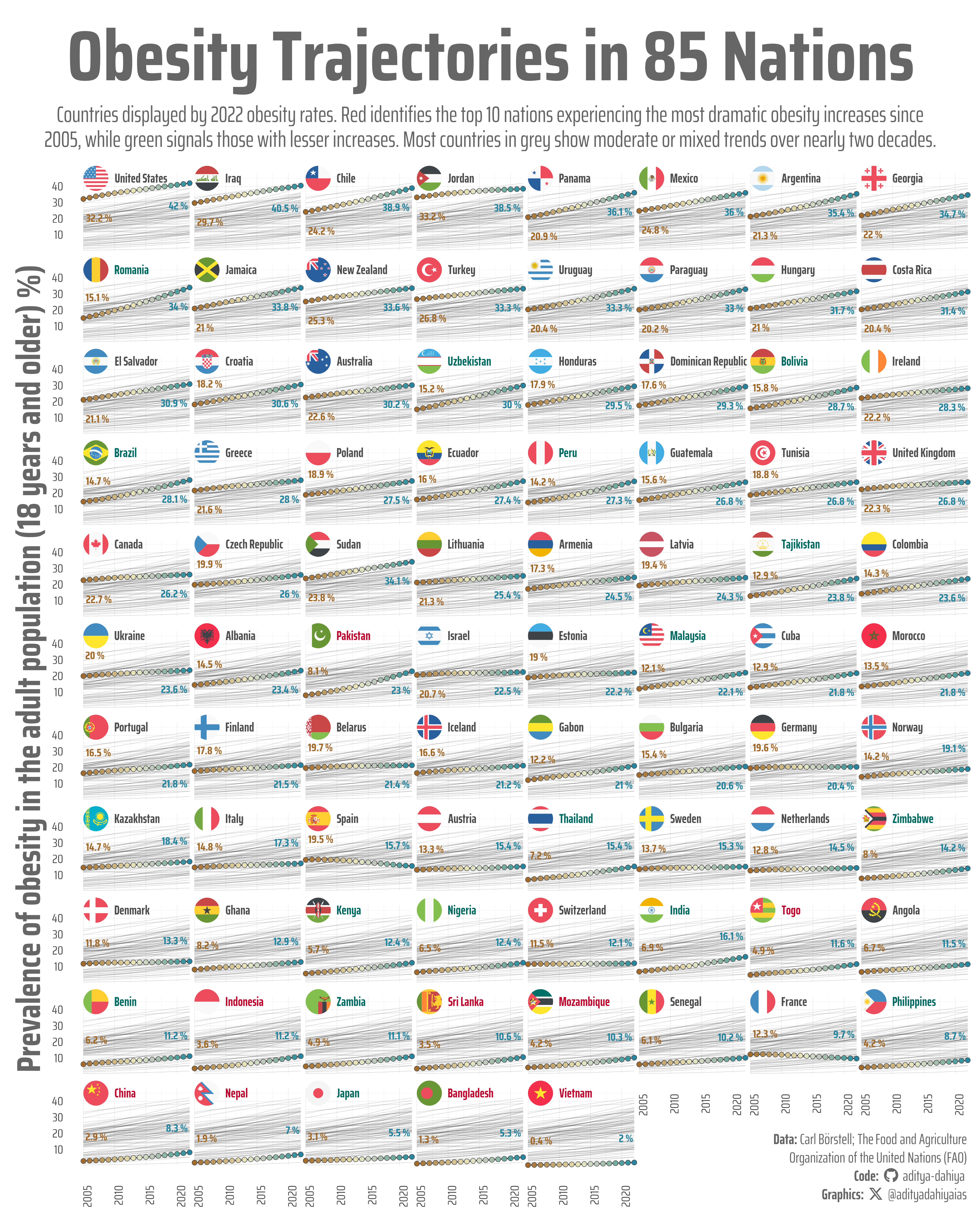 Arranged by current obesity prevalence (highest to lowest), each country’s trajectory reveals its obesity trend from 2005–2022. Red signals the top 10 fastest-rising obesity epidemics; teal indicates nations successfully reducing obesity; grey shows moderate changes.