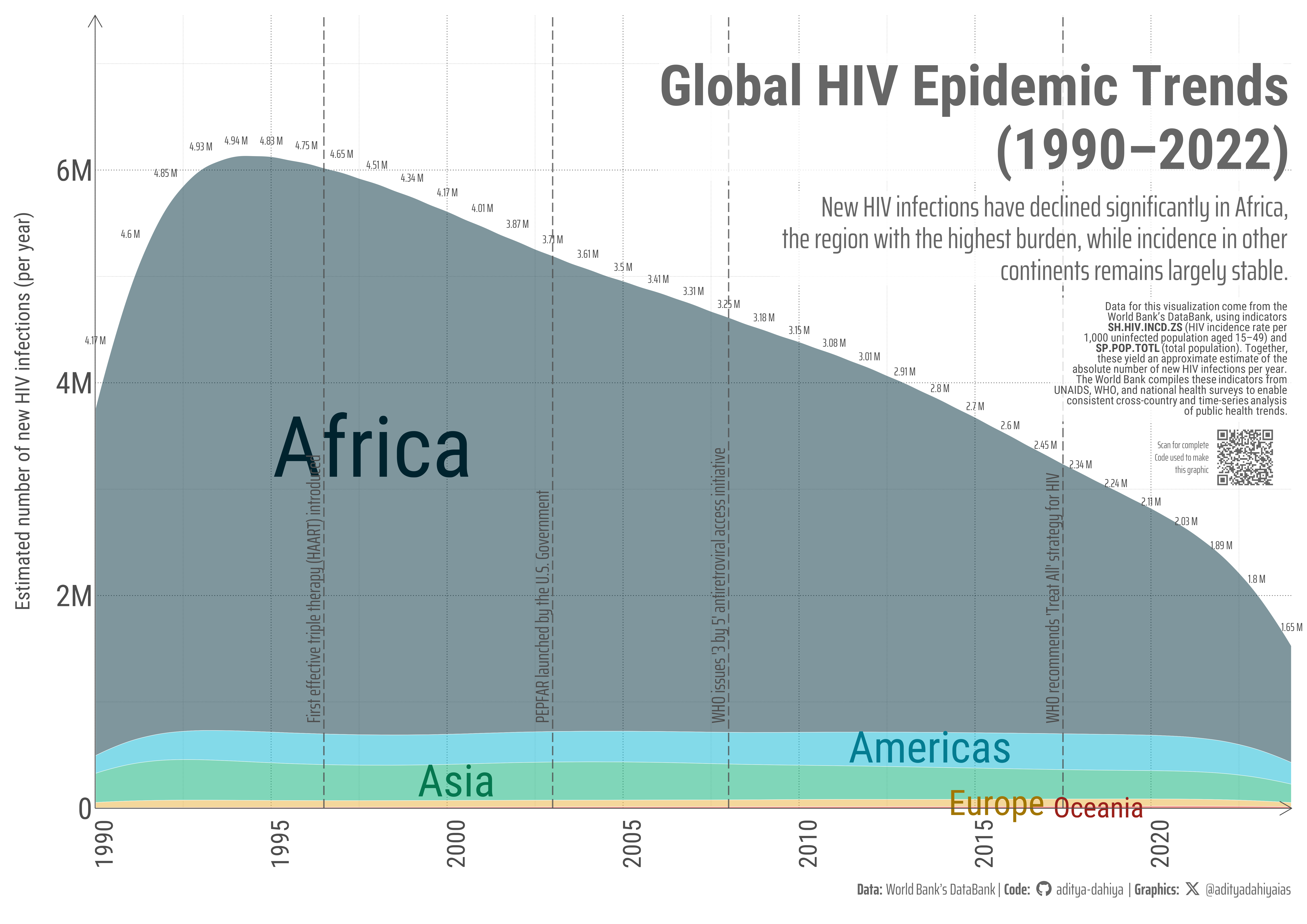 # A QR Code for the infographicurl_graphics <-paste0("https://aditya-dahiya.github.io/projects_presentations/data_vizs/",# The file name of the current .qmd file"wb_aids_incidence", ".html")# remotes::install_github('coolbutuseless/ggqr')# library(ggqr)plot_qr <-ggplot(data =NULL, aes(x =0, y =0, label = url_graphics) ) + ggqr::geom_qr(colour = text_hil, fill = bg_col,size =1 ) +annotate(geom ="text",x =-0.08,y =0,label ="Scan for complete\nCode used to make\nthis graphic",hjust =1,vjust =0.5,family ="caption_font",colour = text_hil,size = bts /6,lineheight =0.35 ) +coord_fixed(clip ="off") +theme_void() +theme(plot.background =element_rect(fill =NA, colour =NA ),panel.background =element_rect(fill =NA,colour =NA ),plot.margin =margin(0, 10, 0, 0, "mm") )# Compiling the plotsg_full <- g +inset_element(p = plot_qr,left =0.92, right =0.98,bottom =0.48, top =0.53,align_to ="full",clip =FALSE ) +plot_annotation(theme =theme(plot.background =element_rect(fill ="transparent",colour ="transparent" ) ) )ggsave(filename = here::here("data_vizs","wb_aids_incidence.png" ),plot = g_full,width =297*2,height =210*2,units ="mm",bg = bg_col)