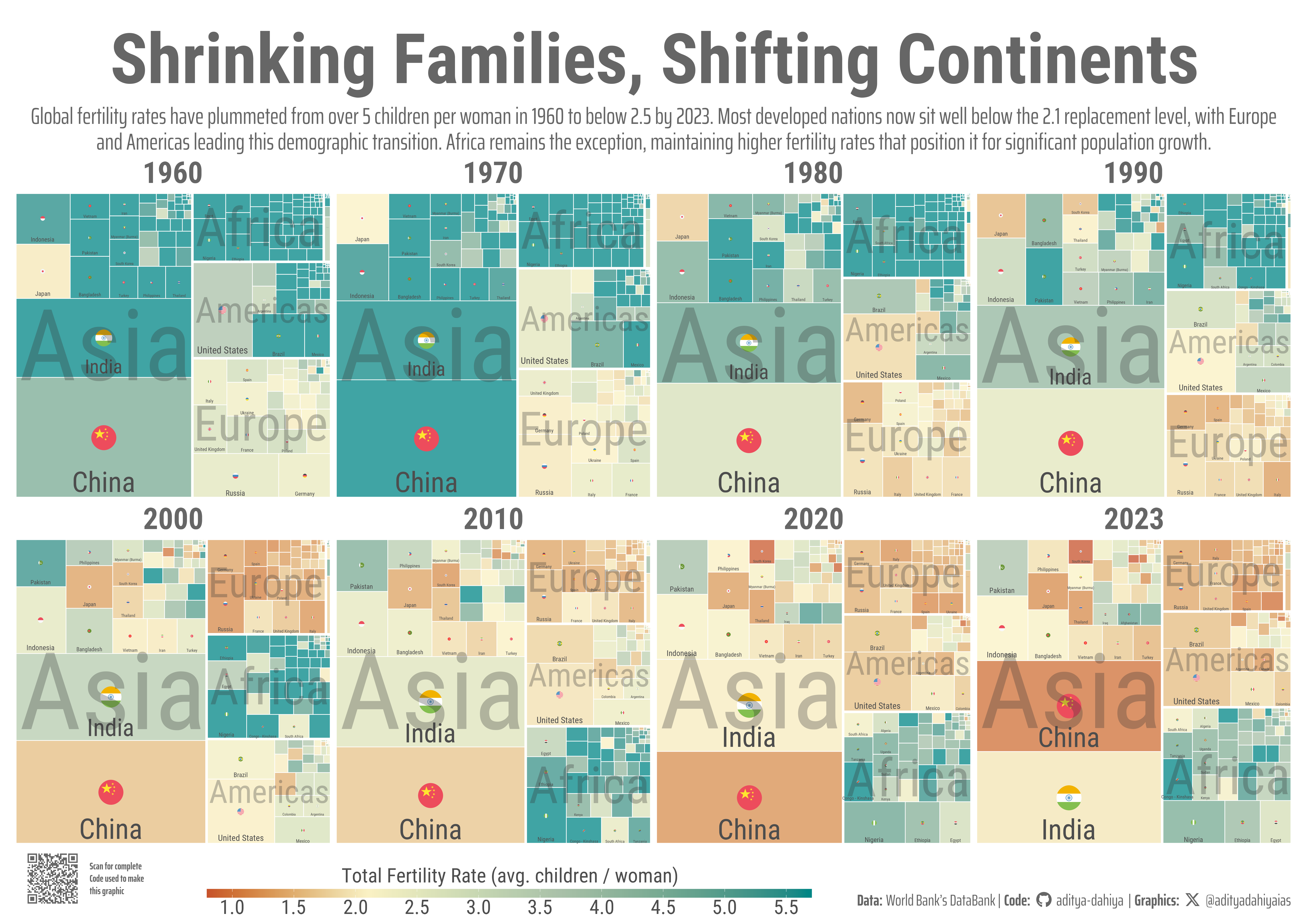 # A QR Code for the infographicurl_graphics <-paste0("https://aditya-dahiya.github.io/projects_presentations/data_vizs/",# The file name of the current .qmd file"wb_tfr_pop_treemap", ".html")# remotes::install_github('coolbutuseless/ggqr')# library(ggqr)plot_qr <-ggplot(data =NULL, aes(x =0, y =0, label = url_graphics) ) + ggqr::geom_qr(colour = text_hil, fill = bg_col,size =0.9 ) +annotate(geom ="text",x =0.045,y =0,label ="Scan for complete\nCode used to make\nthis graphic",hjust =0,vjust =0.5,family ="caption_font",colour = text_hil,size = bts /6,lineheight =0.35,fontface ="bold" ) +coord_fixed(clip ="off") +theme_void() +theme(plot.background =element_rect(fill =NA, colour =NA ),panel.background =element_rect(fill =NA,colour =NA ),plot.margin =margin(0, 10, 0, 0, "mm") )# Compiling the plotsg_full <- g +inset_element(p = plot_qr,left =0, right =0.12,bottom =0, top =0.09,align_to ="full",clip =FALSE ) +plot_annotation(theme =theme(plot.background =element_rect(fill ="transparent",colour ="transparent" ) ) )ggsave(filename = here::here("data_vizs","a4_wb_tfr_pop_treemap.png" ),plot = g_full,width =297*2,height =210*2,units ="mm",bg = bg_col)