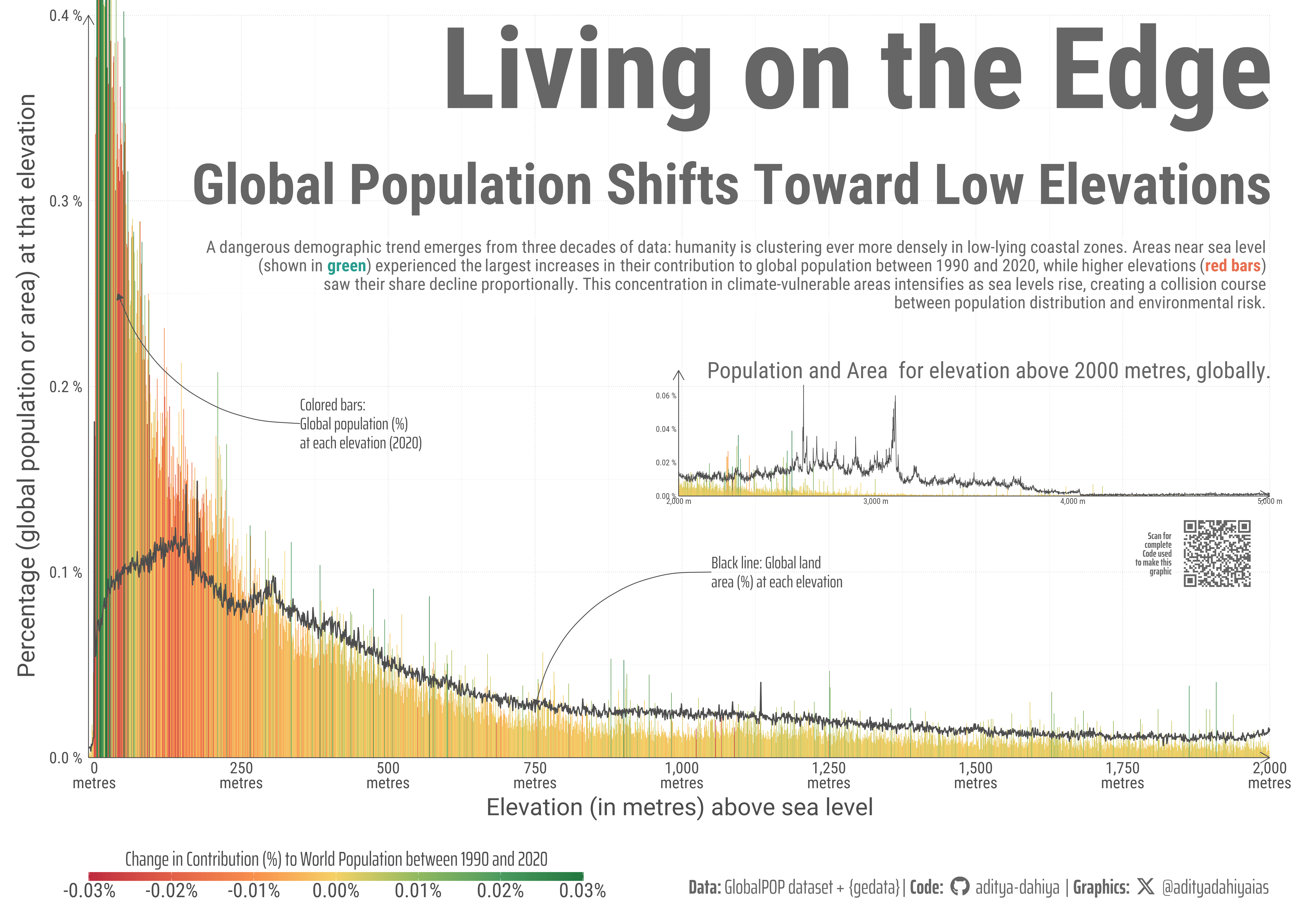 plot_title1 <-"Living on the Edge"plot_title2 <-"Global Population Shifts Toward Low Elevations"plot_subtitle <-"A dangerous demographic trend emerges from three decades of data: humanity is clustering ever more densely in low-lying coastal zones. Areas near sea level<br>(shown in <span style='color:#2a9d8f;'>**green**</span>) experienced the largest increases in their contribution to global population between 1990 and 2020, while higher elevations (<span style='color:#e76f51;'>**red bars**</span>)<br>saw their share decline proportionally. This concentration in climate-vulnerable areas intensifies as sea levels rise, creating a collision course<br>between population distribution and environmental risk."str_view(plot_subtitle)inset_text <-"world_elev_pop_chart"str_view(inset_text, pattern ="<br>")